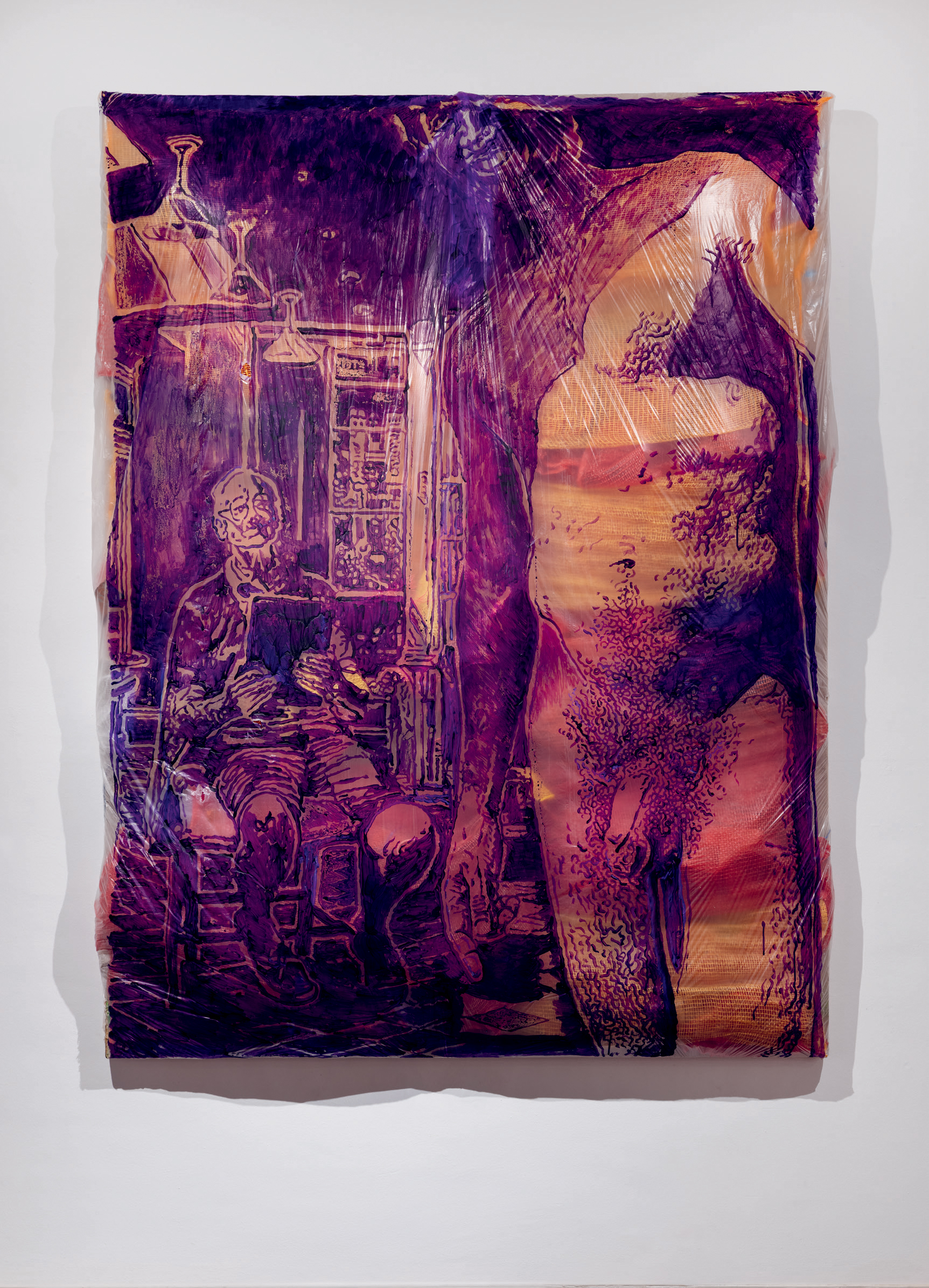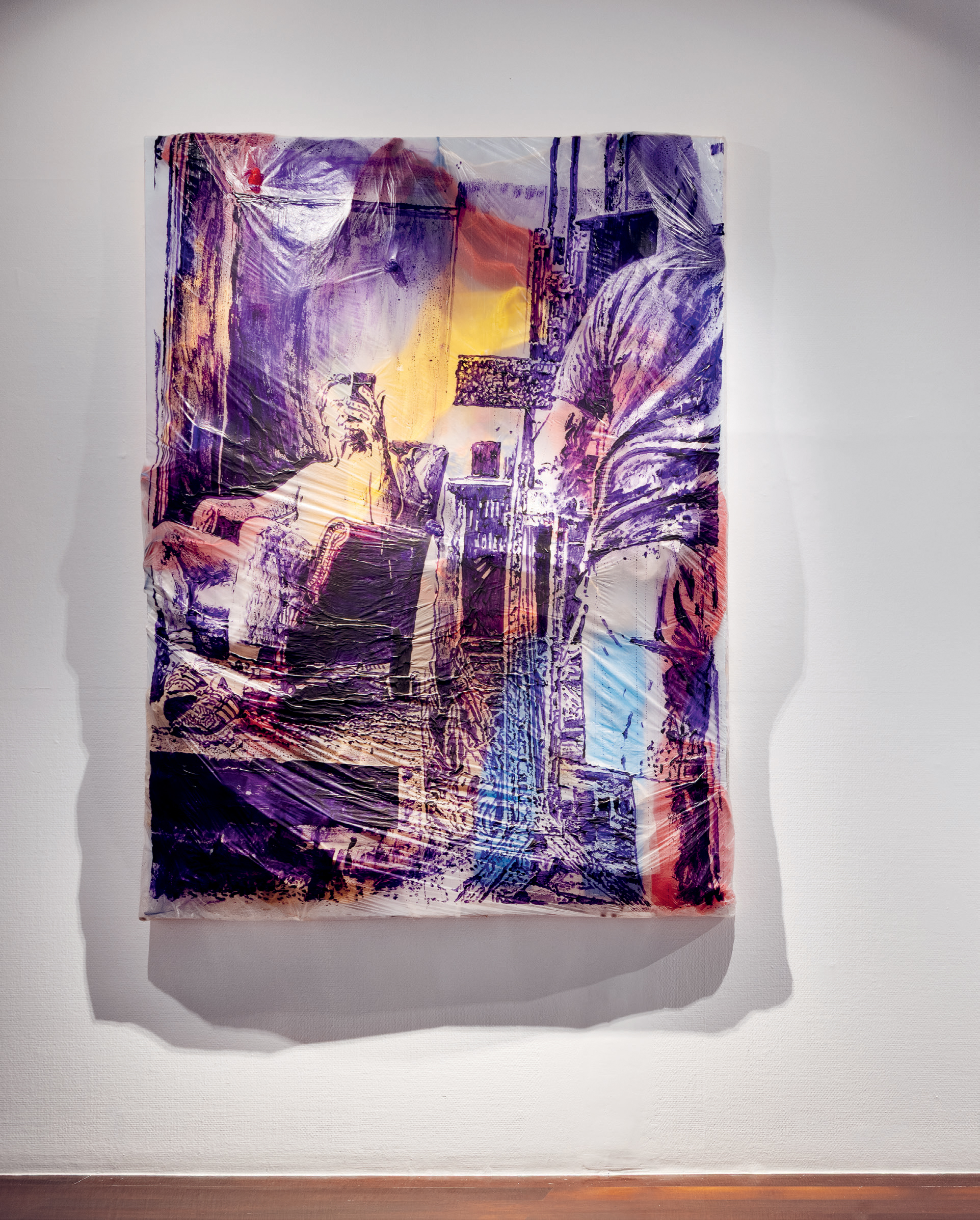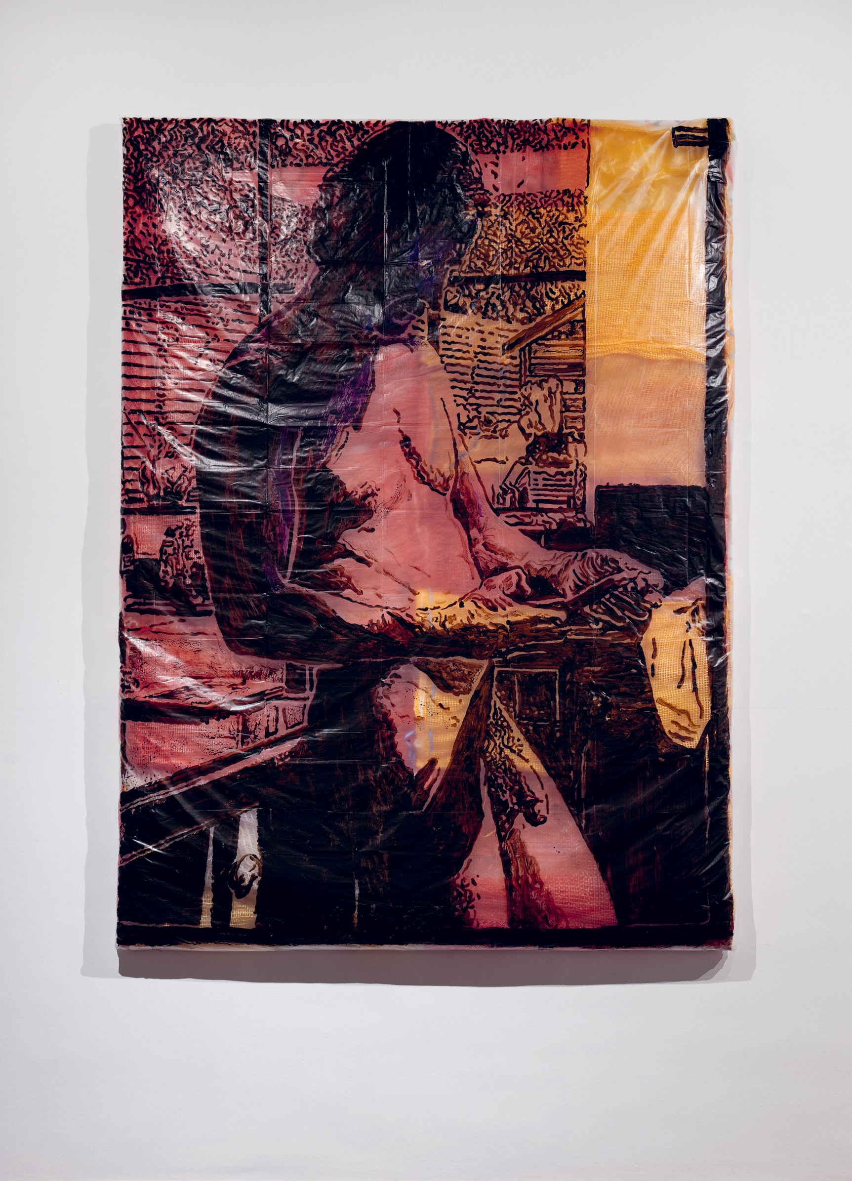 2025 | Acrylic paint, plastic, lemon and feed bags, canvas, wooden grid | 200 x 150 x 4 cm