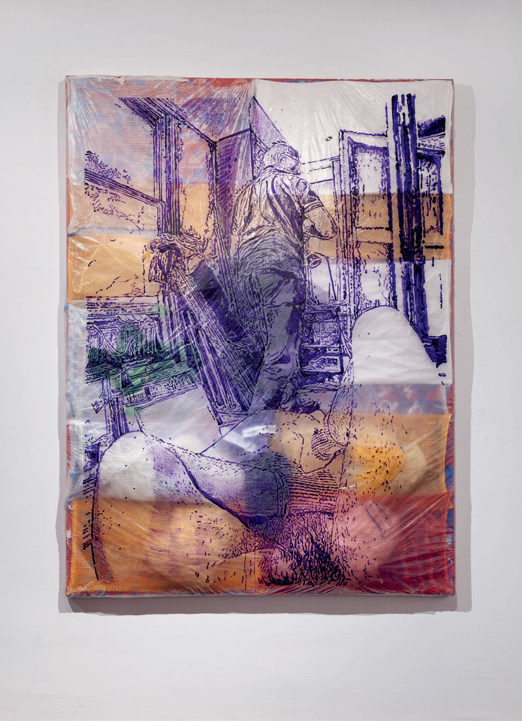 2025 | Acrylic paint, plastic, lemon and feed bags, canvas, wooden grid | 202 x 153 x 13 cm